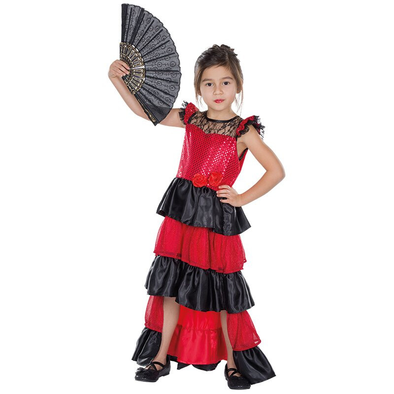 Rotes Flamenco-Kleid mit schwarzem Spitzenbesatz an den kurzen Flügelärmeln und entlang des Ausschnittes. Das paillettenbesetzte Oberteil ist an der Taille mit roten Stoffrosen besetzt. Der Rock ist vorne halblang und hinten lang und hat rote sowie schwarze Volants.